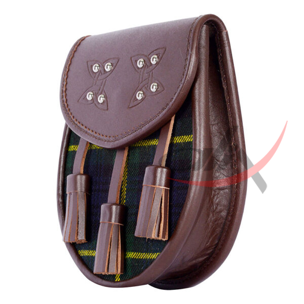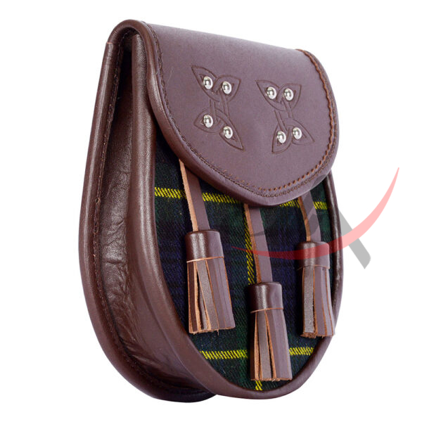 Scottish Sporran Gordon Tartan Brown Leather Made to Order offers clan pride and customization in a very budget conscious price tag. Your Family Tartan is pasted on the front of the sporran equipped with 3 matching leather tassels.
