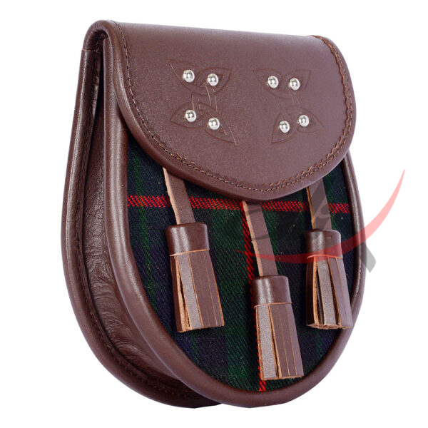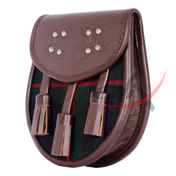 Scottish Sporran Gunn Tartan Brown Leather Made to Order offers clan pride and customization in a very budget conscious price tag. Your Family Tartan is pasted on the front of the sporran equipped with 3 matching leather tassels.