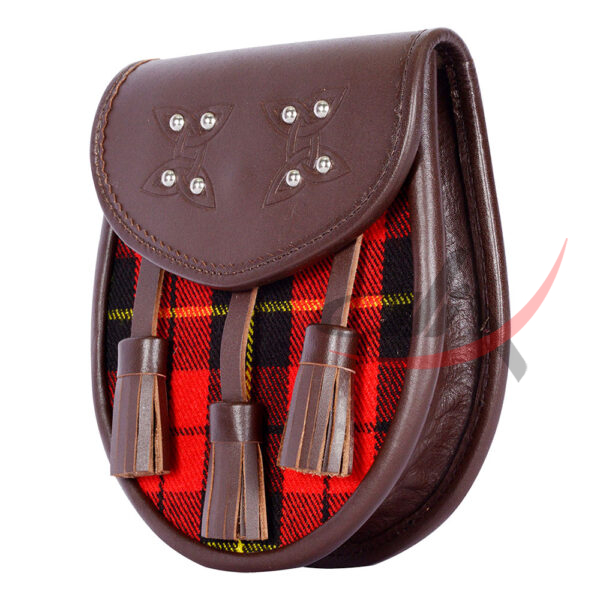 Scottish Sporran Wallace Tartan Brown Leather Made to Order and customization in a very budget conscious price tag. Your Family Tartan is pasted on the front of the sporran equipped with 3 matching leather tassels.